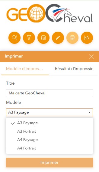 Pour imprimer votre carte sur GeoCheval, vous devez d’abord vous connecter à la carte premium. Une fois connecté, naviguez jusqu’à la section de la carte que vous souhaitez imprimer en zoomant. Ensuite, cliquez sur l’icône de l’imprimante. Il vous suffira de choisir le format qui convient le mieux à votre impression et de donner un titre à votre carte.